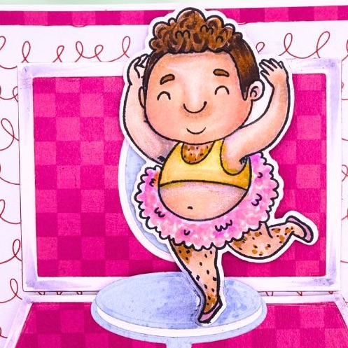 - Stamp the dinosaur playing drums image towards the bottom of a white piece if cardstock measuring 1 3/4 2 in x 3 3/4 in. Color with your favorite medium. I used Olo and Copic together, with some white pencil.
