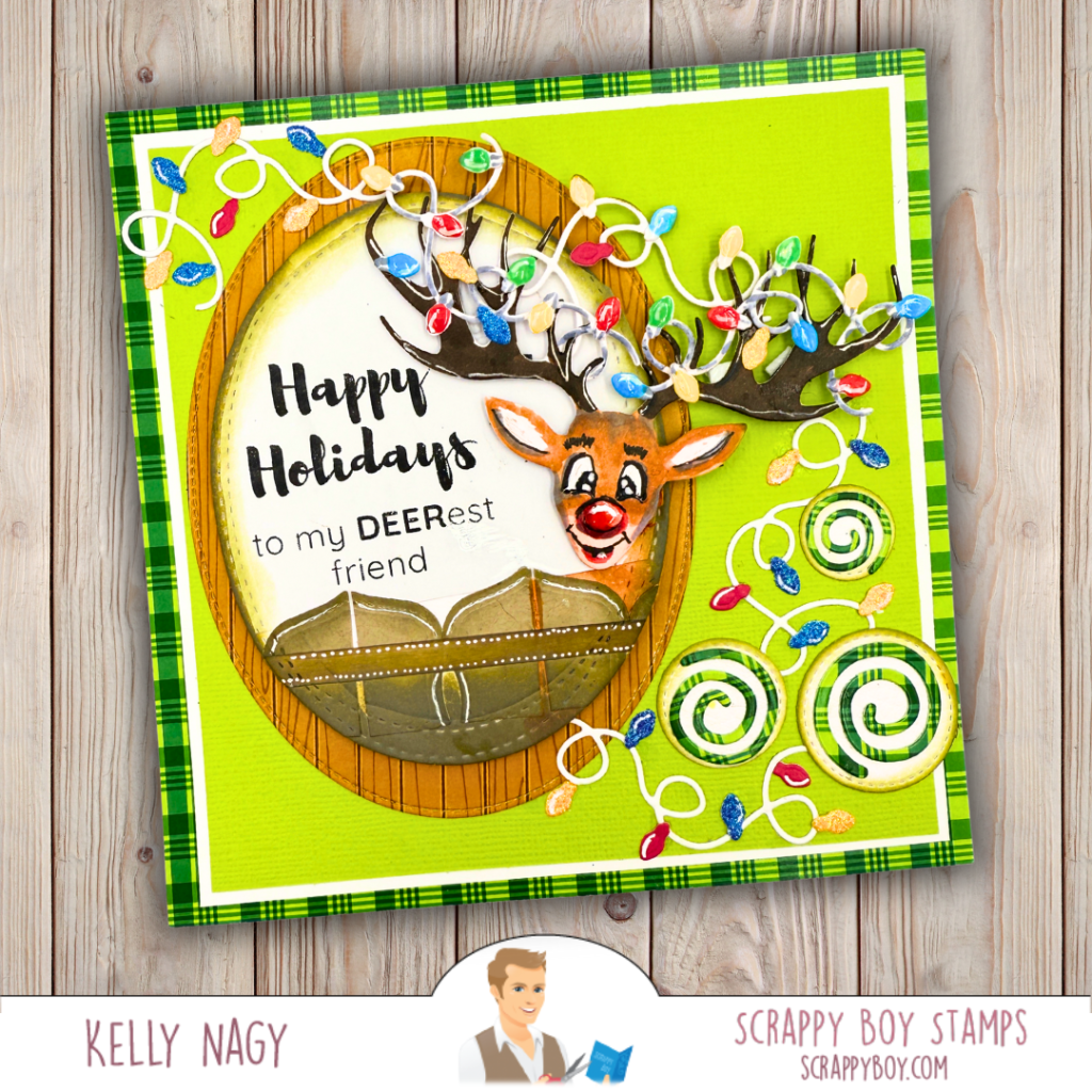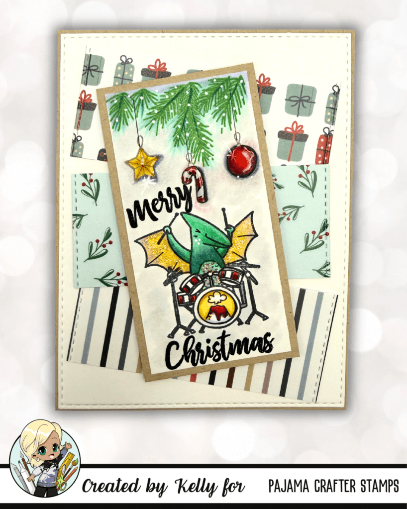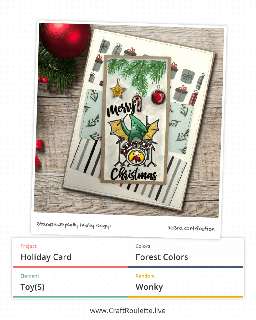 - Toys element: I used the dinosaur playing drums from Dino-mite Birthday Stamp Set, ornament images from the Weinerful Christmas Stamp Set, pine branch from the Rustic Christmas Owl Stamp Set and the sentiment from the Holly Jolly Christmas Stamp Set.