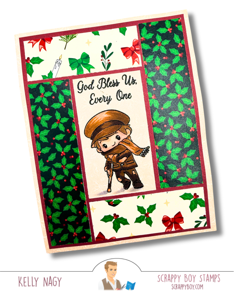 - Wonky layout: the tilted stitched panels using 3 different patterned papers from the 6×6 paper pack called WINTER PARADE. plus a slightly askew sentiment strip makes the card feel fun and handmade.
