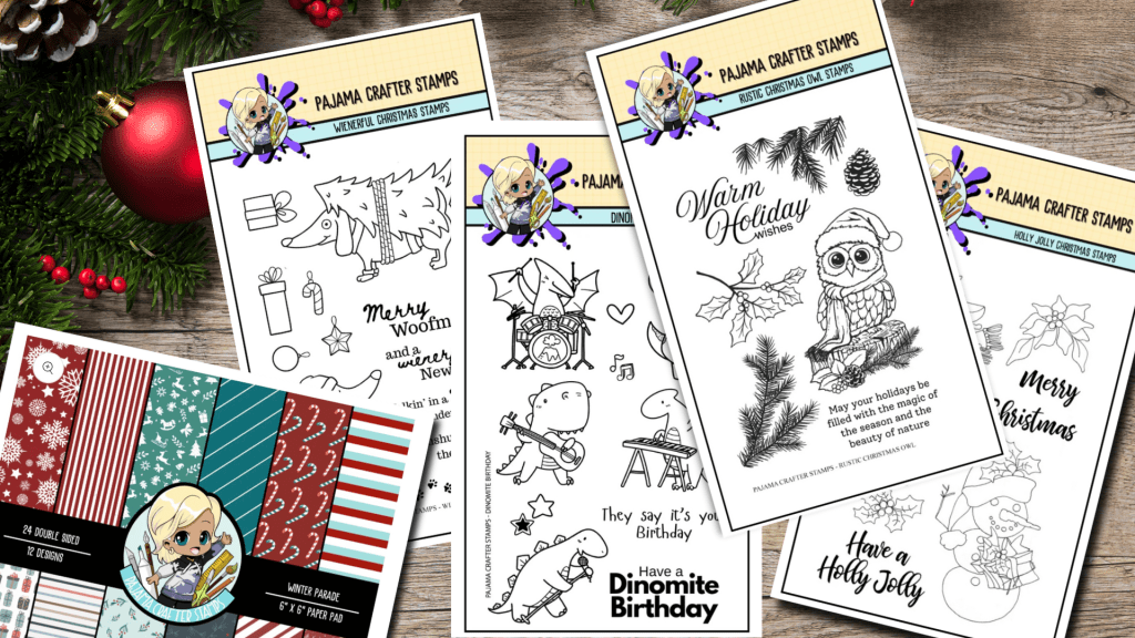 If you liked this, try the same sketch with different color combos or swap the images for other critters, toys or ornaments. Thanks for stopping by โ and if you shop Pajama Crafter Stamps, Iโd appreciate you using my affiliate link above!