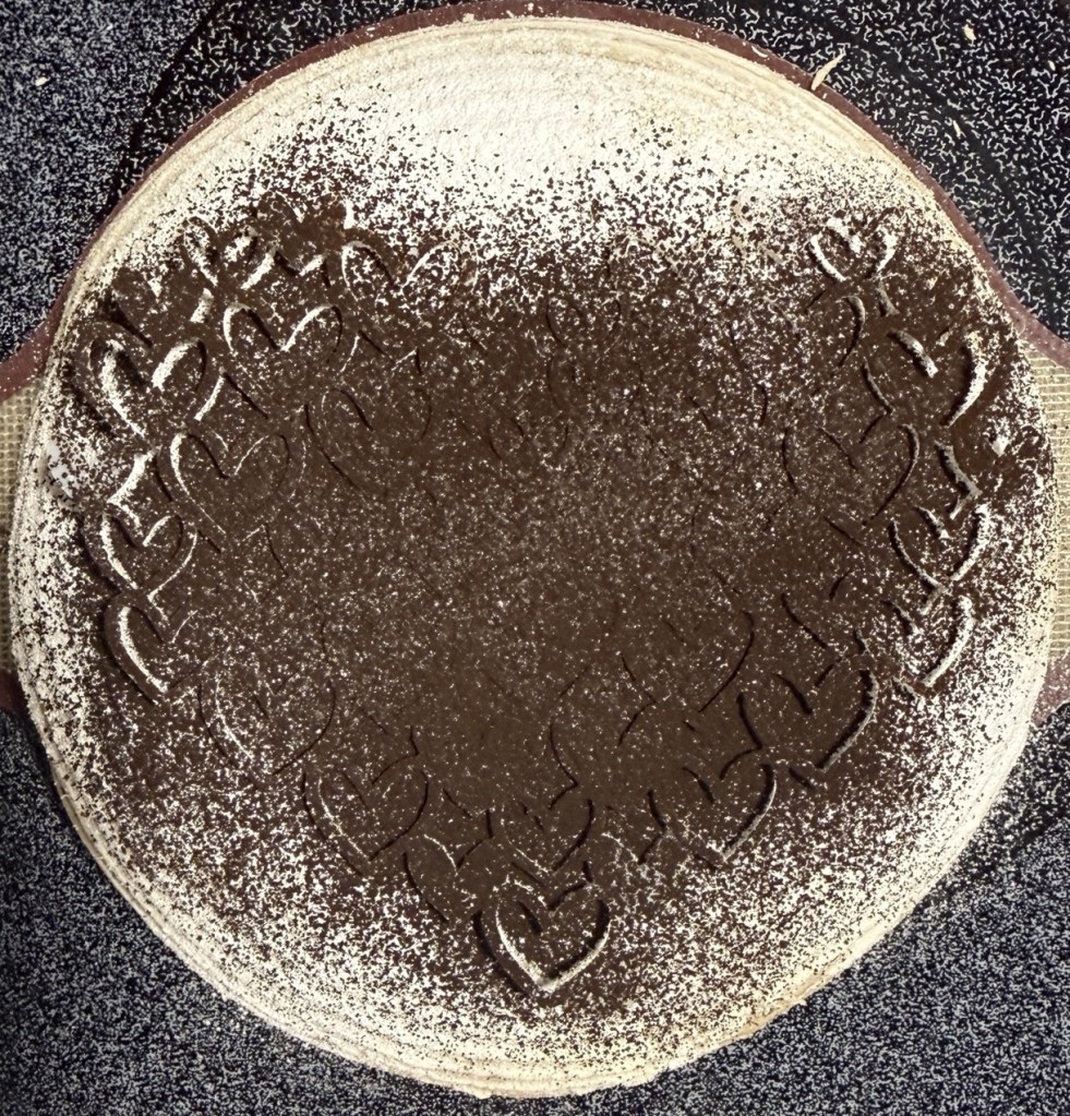 Position the stencil, and sprinkle black cocoa and white rice flour over it for a beautiful heart pattern.