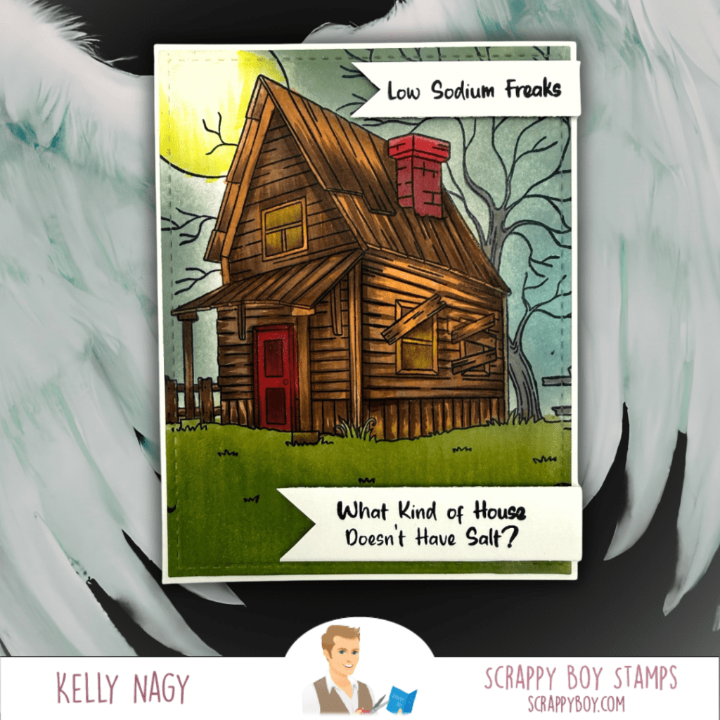 The Spooky Farmhouse 6×6 Background Stamp brings in layered texture and seasonal depth. I cut it down to fit a standard A2 sized card front.