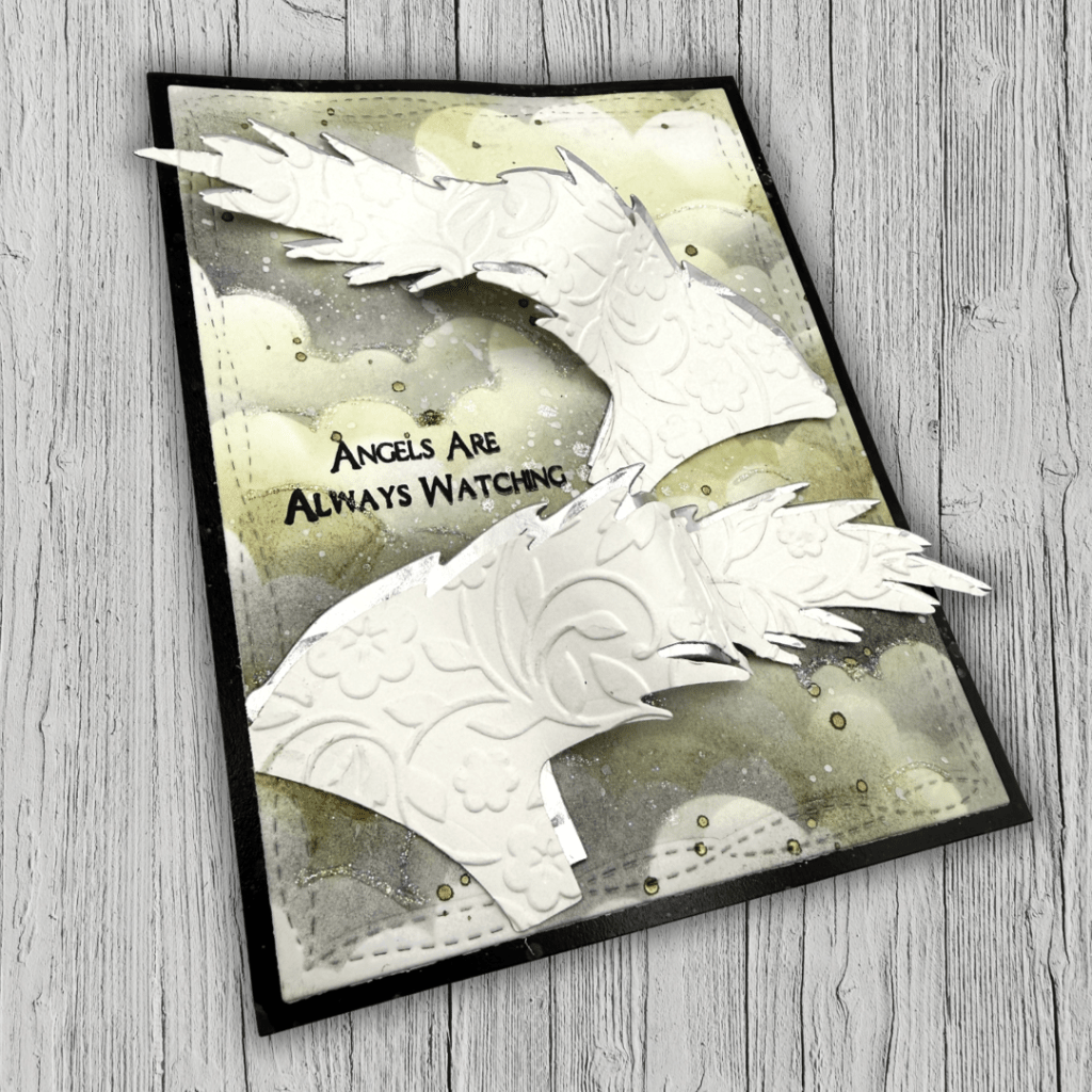 The Wings & Sun Dieset offers a softer, uplifting focal point with dimension. I ran the diecut wings through an embossing machine using a folder from my stash. I think it adds fun dimension, but not necessary. I then applied foam tape in thin strips to create waves and movement. The sentiment is from Bump In The Night and great to send an uplifting message, “Angels Are Always Watching.”