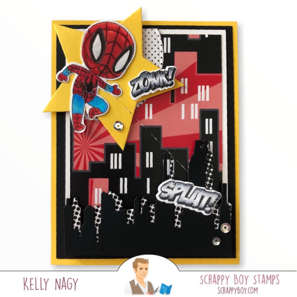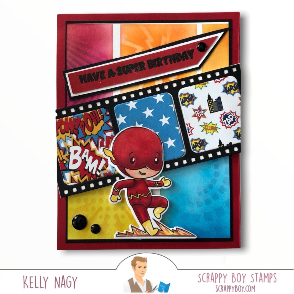 I had so much fun making this card. I wanted it to be colorful, like I remember the comic pages used to be, tucked in between the other black and white pages of the Sunday paper. I wanted there to be lots of angles and layers of tone on tone colors behind my focal point, one of the cutest little super heroes you ever did see in a stamp set from http://www.ScrappyBoy.com.