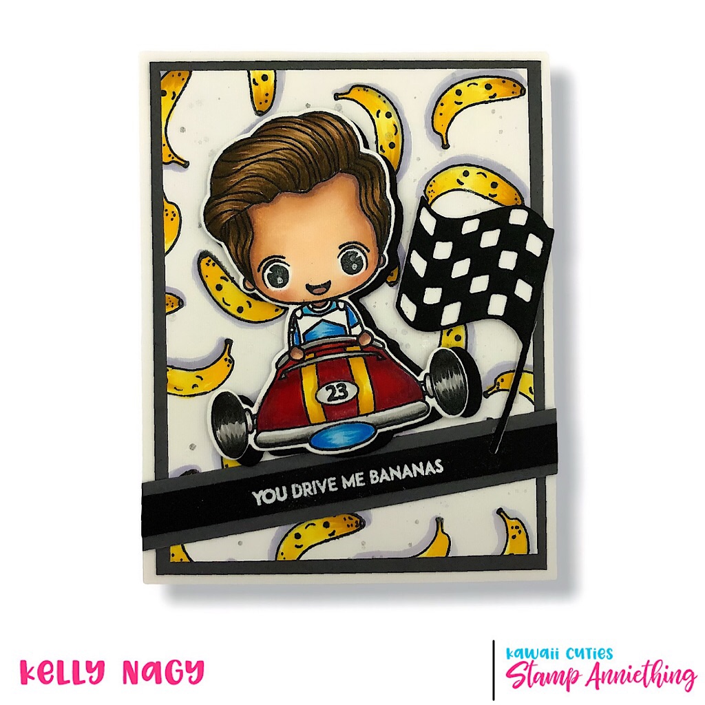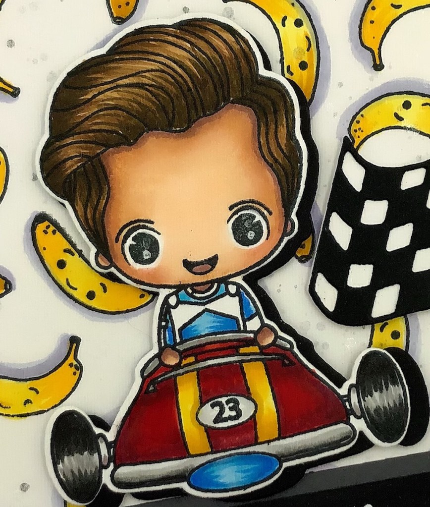 William was popped up with double-stick foam tape. As well as the checkered flag and sentiment. The sentiment was heat embossed on a strip of black paper with white embossing powder using my Stamp Anniething HOT PINK heat gun and then adhered to the banana panel, I previously created, at an angle and used as a grounding or landing spot for the main image.