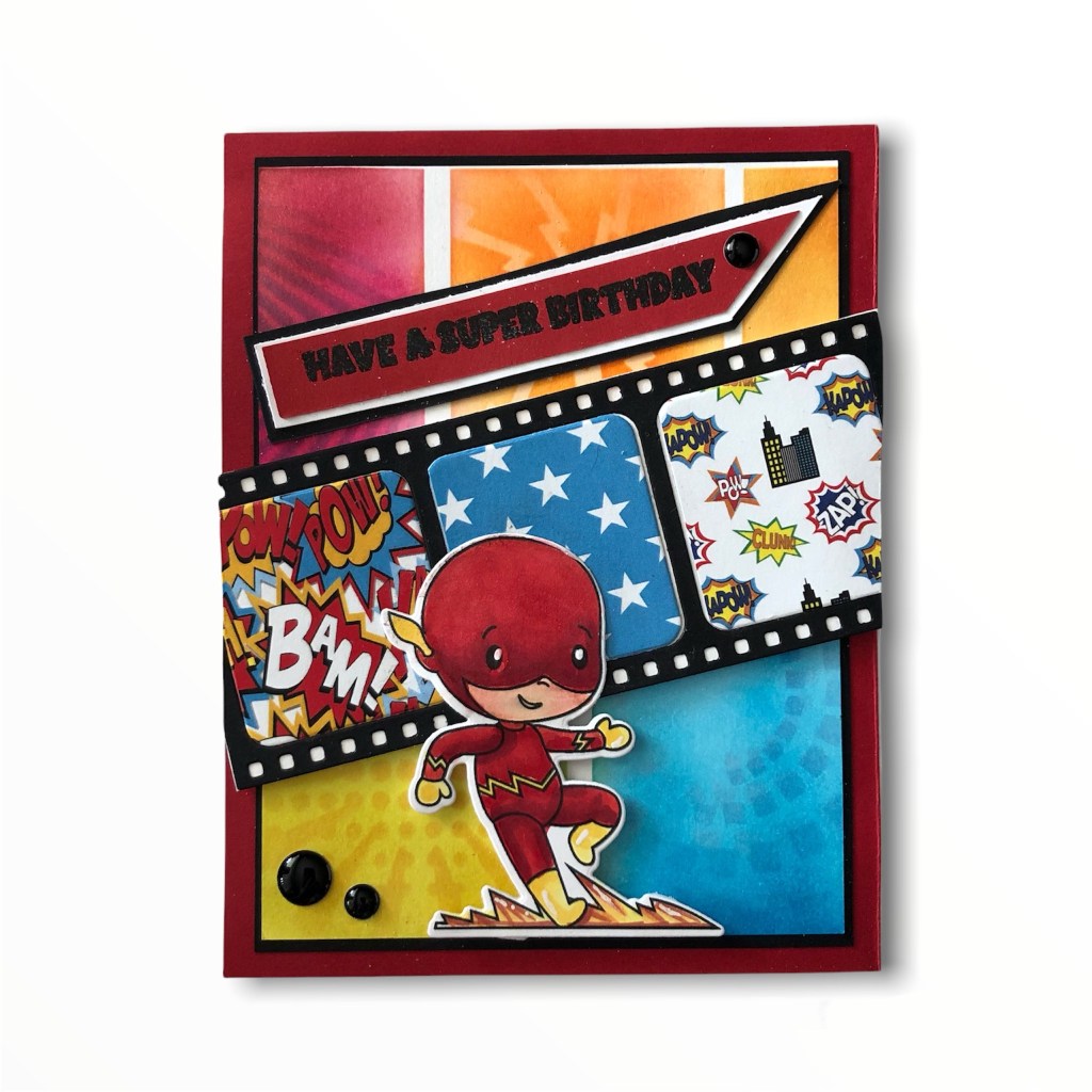 I decorated the front by gluing a filmstrip diecut, after piecing patterned paper from the coordinating 6×6 paper pack called SuperHeros. This was adhered to the card front at an angle with double-stick foam tape for added dimension.