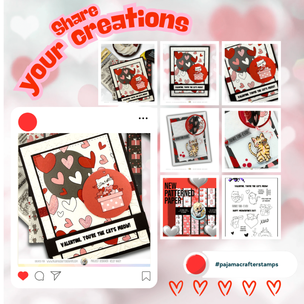 For everything you need, including the Meowentine Stamps, patterned papers, and cute desktop accessories, be sure to check out my affiliate link: Pajama Crafter Stamps (https://pajamacrafterstamps.com/STAMPEDBYKELLYBLOG).