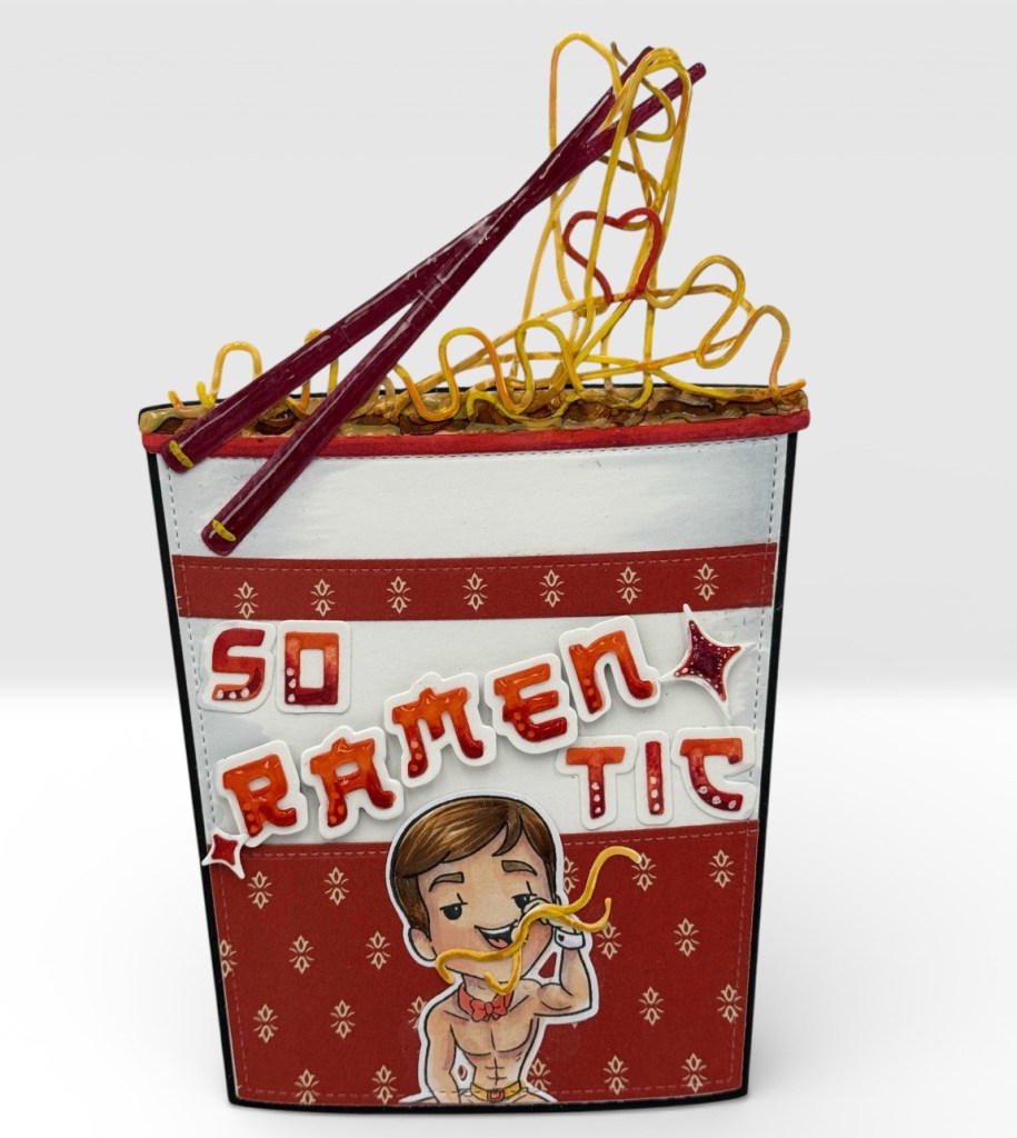 Next, I used the new whimsical ramen die and paired with the previous “Charmed and Chiseled” release! Using the coordinating outline dies for the noodle die, I swapped out the original cherry in its hands, showcasing a fun way to stretch your stash. One of my favorite things about Scrappy Boy is how easily the scales of the images blend across different lines—perfect for mixing and mashing as you create outside the box! 🌈