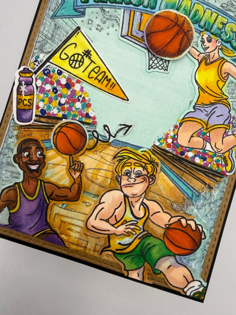 - Interpretation: I leaned into the energy of March Madness—single-elimination drama, buzzer-beaters, and team spirit—by using a hashtag on pennant flag, scoreboard-style accents, trophy, water bottle and the 3 basketball players featured in the Let’s Bounce stamp set.