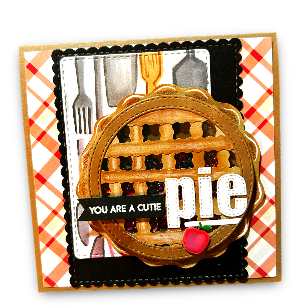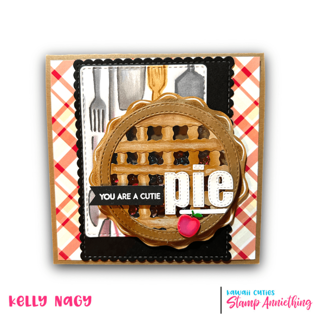 Finally, you can add some touches to make it look like a pie – for example, you can cut small strips of card stock in 1/4 in strips either with decorative scissors or your paper trimmer. Consider ink blending the edges to create a visual effect of being browned in the oven. Other options for a decorative edge could be to use the edger dies from Stamp Anniething to make it look more like rippled pastry to form the lattice crust.