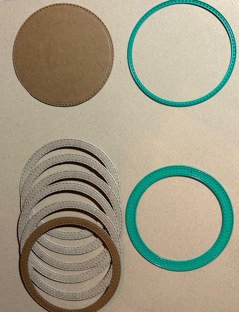 To get started, you’ll need the Circle Shaker Basics 1 set, some cardstock in your desired color, chipboard, acetate sheet, shaker bits and liquid adhesive. Begin by die-cutting 5 circles using the circle “frame” die from the set – one from cardstock and the others from chipboard. Make sure when gluing together, they match up in size.