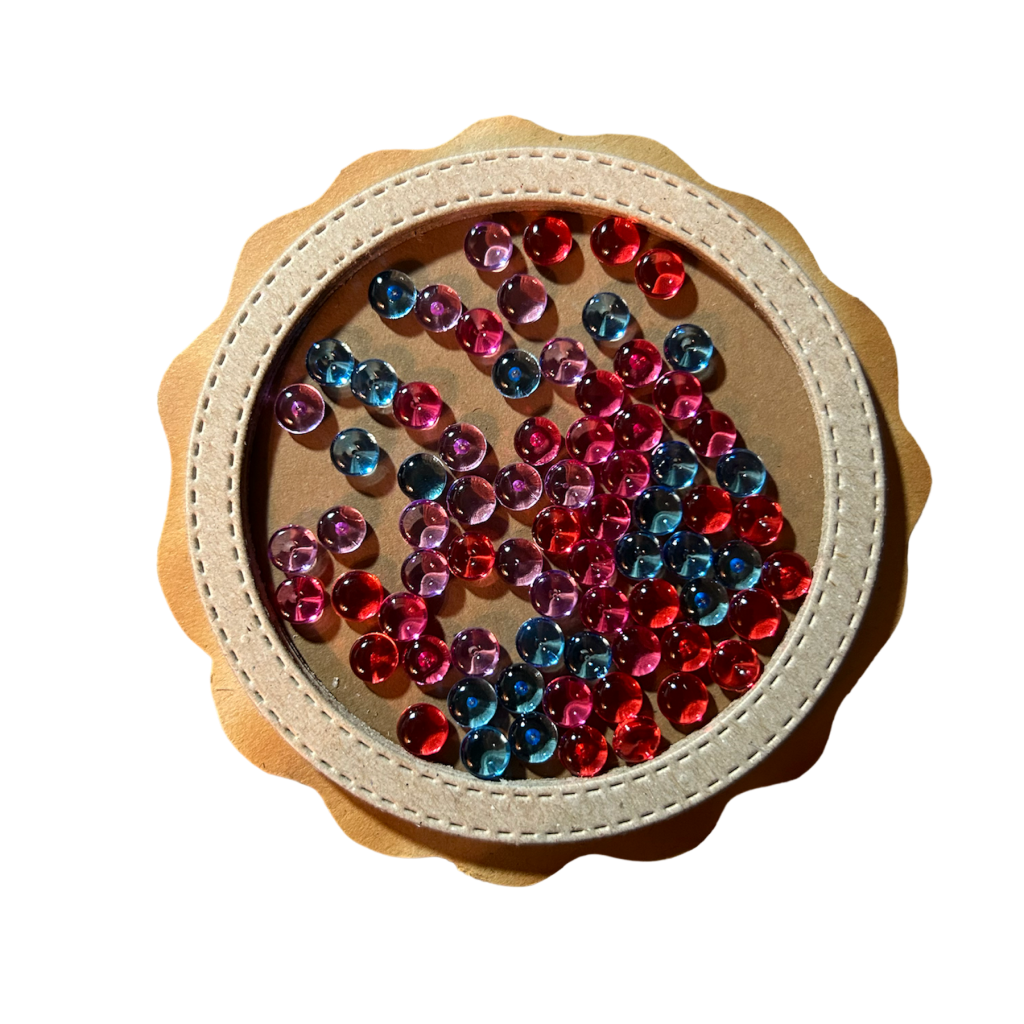 Now, add the shaker bits-on top of the cardstock circle in the well you created, as desired – you can add whatever you want to create interest (sequins, clay shaker bits, etc). I used jelly dots. You can use one color or simply mix a variety of colors for a more random look, as I have done here. Once you’re happy with how the shaker filling are arranged, carefully glue the cardstock circle onto the top on the acetate circle to seal.