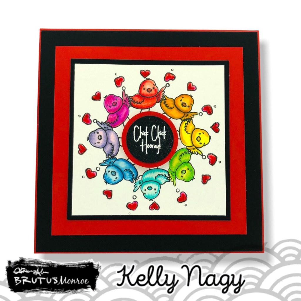 I used a stamp positioner and the Wreath Builder Stencil from Gina K Designs to create the wreath with chick images and a smaller heart stamp to create the front of my card panel.