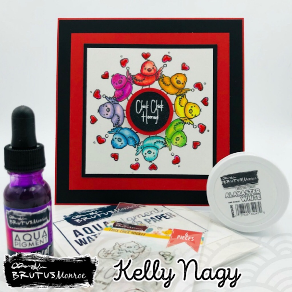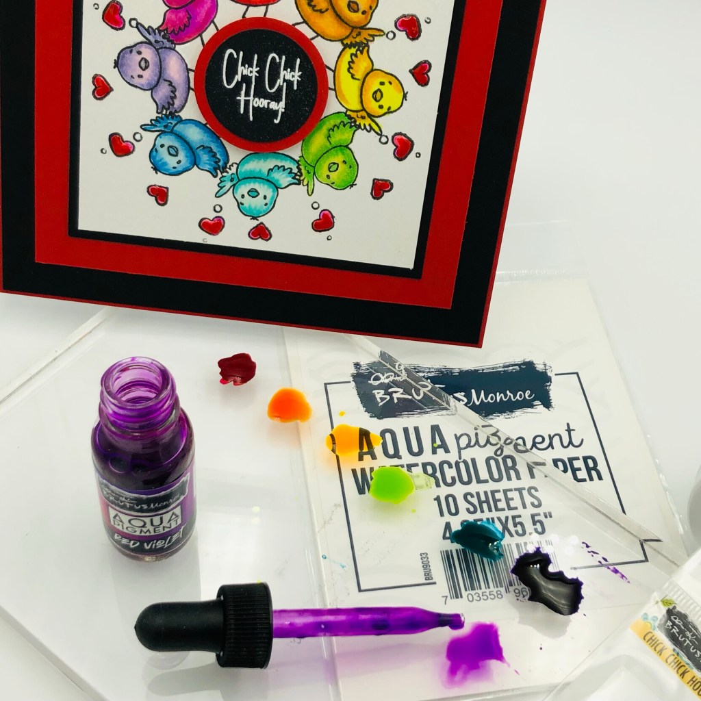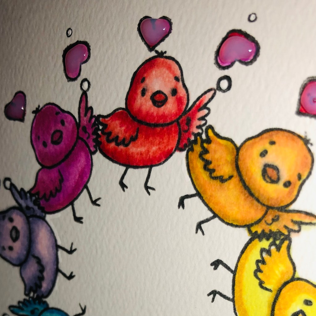 I used a rainbow pattern of aqua pigments and colored the images as you would watercolor. I used red to color all the hearts. Once dried, I added a small amount of glossy accents to each of the hearts for added shine and dimension.